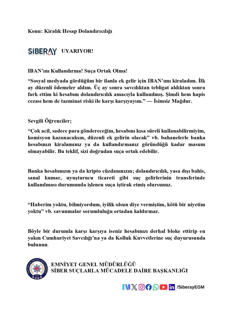 Tanıdığınız ya da tanımadığınız kişilerden gelen, hesap veya IBAN paylaşımı karşılığında kazanç vaadi içeren her türlü teklifi reddetmeniz ve şüpheli durumları derhâl güvenlik yetkililerine bildirmeniz önem arz etmektedir.