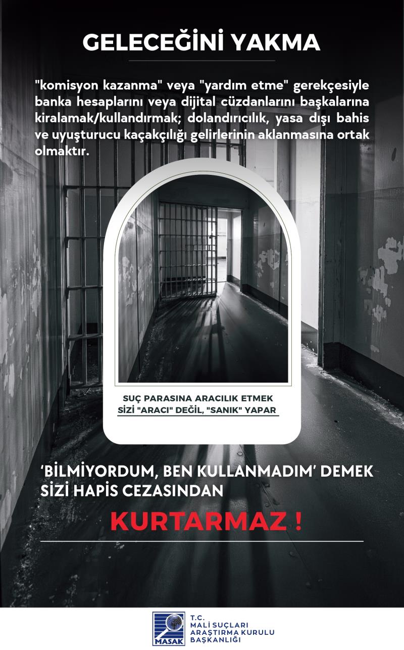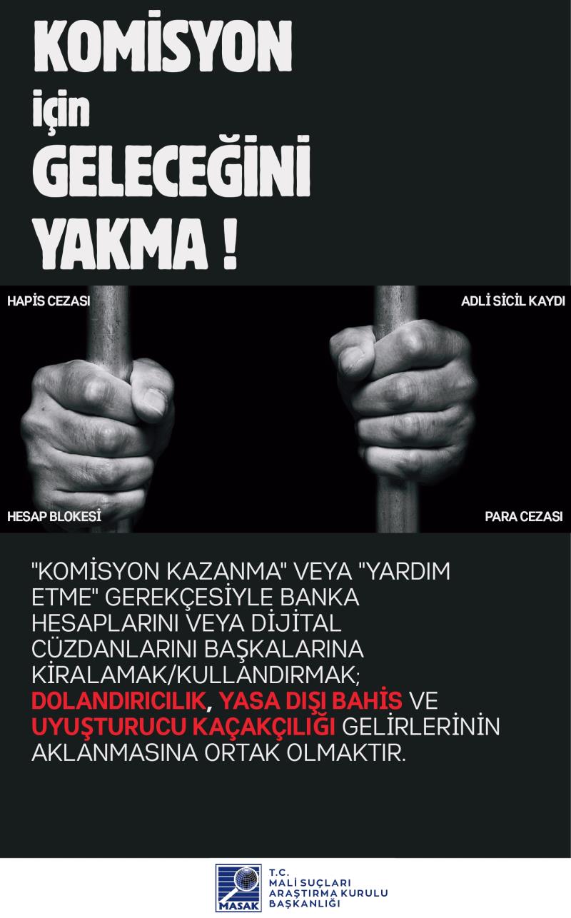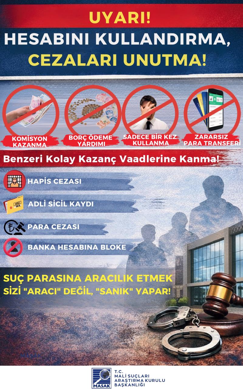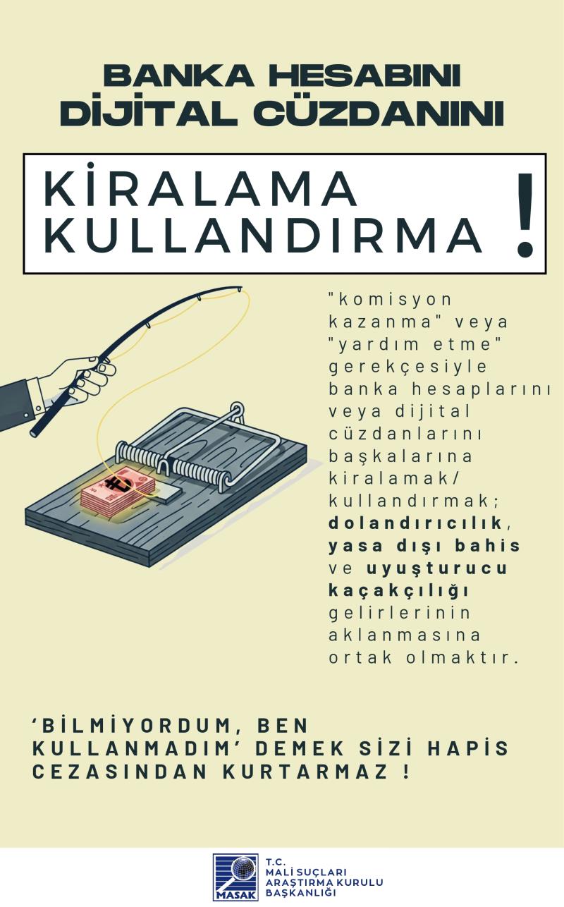 Kendi adınıza kayıtlı banka hesaplarınızın veya dijital cüzdanlarınızın; “komisyon kazanma”, “borç ödeme yardımı”, “sadece bir kez kullanma”, “zararsız para transferi” veya benzeri gerekçelerle başkaları tarafından kullanılmasına bilerek ve isteyerek izin verilmesi, Türk Ceza Kanunu ve ilgili mevzuat kapsamında cezai ve hukuki sorumluluk doğurabilir. Hesaplarınız üzerinden gerçekleştirilen işlemlerden, işlemi fiilen yapan kişi kim olursa olsun, hesap sahibi olarak siz sorumlu tutulabilirsiniz.